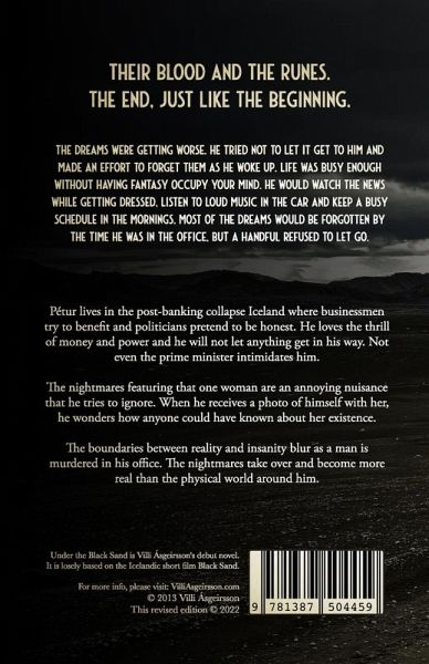Their blood and the runes. The end, just like the beginning. Pétur lives in the post-banking collapse Iceland where businessmen try to benefit and politicians pretend to be honest. He loves the thrill of money and power and he will not let anything get in his way. Not even the prime minister intimidates him. The nightmares featuring that one woman are anannoying nuisancethat he tries to ignore. When he receives a photo of himselfwith her, he wonders how anyone could have known abouther existence. The boundaries between reality and insanityblur as a man is murdered in his office. The nightmares takeover and become more real than the physical world around him.