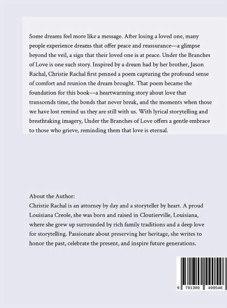 Under the Branches of Love A Story of Reunion, Love, and Peace Some dreams feel more like a message. After the loss of a loved one, many find themselves longing for a sign-some small reassurance that their loved one is at peace. Under the Branches of Love is a beautifully crafted story inspired by a powerful dream that brought just that. When Christie Rachal's brother, Jason Rachal, experienced a vivid dream after their beloved aunt's passing, it left their family speechless. The dream painted a vision of reunion, comfort, and everlasting love-a reminder that those we cherish never truly leave us. That dream first became a poem, then blossomed into this heartfelt story, written to bring peace to those who grieve and remind them that love transcends time and space. With lyrical prose and breathtaking imagery, Under the Branches of Love is a tender and uplifting tale for anyone who has ever wished for one more moment with someone they love. It's a story of family, faith, and the unbreakable bonds that connect us-even beyond this life. Perfect for readers seeking comfort, hope, and the gentle embrace of a timeless love, this book is a beautiful keepsake for those who believe that love is eternal.
