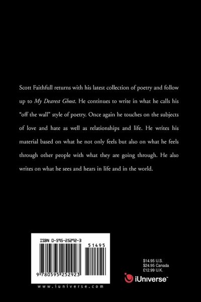 Scott Faithfull returns with his latest collection of poetry and follow up to "My Dearest Ghost." He continues to write in what he calls his "off the wall" style of poetry. Once again he touches on the subjects of love and hate as well as relationships and life. He writes his material based on what he not only feels but also on what he feels through other people with what they are going through. He also writes on what he sees and hears in life and in the world.