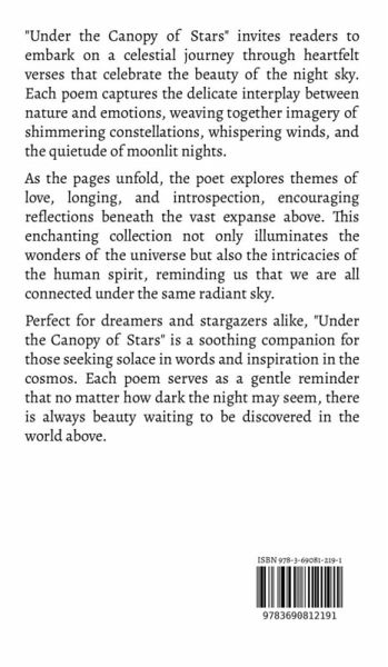 "Under the Canopy of Stars" invites readers to embark on a celestial journey through heartfelt verses that celebrate the beauty of the night sky. Each poem captures the delicate interplay between nature and emotions, weaving together imagery of shimmering constellations, whispering winds, and the quietude of moonlit nights. As the pages unfold, the poet explores themes of love, longing, and introspection, encouraging reflections beneath the vast expanse above. This enchanting collection not only illuminates the wonders of the universe but also the intricacies of the human spirit, reminding us that we are all connected under the same radiant sky. Perfect for dreamers and stargazers alike, "Under the Canopy of Stars" is a soothing companion for those seeking solace in words and inspiration in the cosmos. Each poem serves as a gentle reminder that no matter how dark the night may seem, there is always beauty waiting to be discovered in the world above.