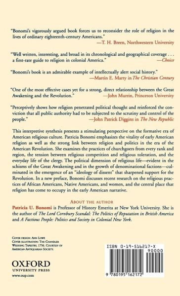 In this pathbreaking study, Patricial Bonomi argues that religion was as instrumental as either politics or the economy in shaping early American life and values. Looking at the middle and southern colonies as well as at Puritan New England, Bonomi finds an abundance of religious vitality through the colonial years among clergy and churchgoers of diverse religious backgrounds. The book also explores the tightening relationship between religion and politics and illuminates the vital role religion played in the American Revolution. A perennial backlist title first published in 1986, this updated edition includes a new preface on research in the field on African Americans, Indians, women, and the Great Awakening, and Atlantic history and how these impact her interpretations.