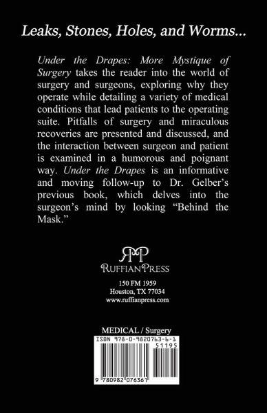 "Under the Drapes: More Mystique of Surgery" takes the reader into the world of surgery and surgeons, exploring why they operate, while detailing a wide variety of medical conditions that lead patients to the operating suite. The interaction between surgeon and patient is also examined in humorous and poignant ways. Pitfalls of surgery, as well as miraculous recoveries are presented and discussed. "Under the Drapes" is an informative and moving follow-up to Dr. Gelber's previous book, "Behind the Mask: The Mystique of Surgery and the Surgeons Who Perform Them," which delved into the surgeon's thought processes before, during and after a surgery is performed.