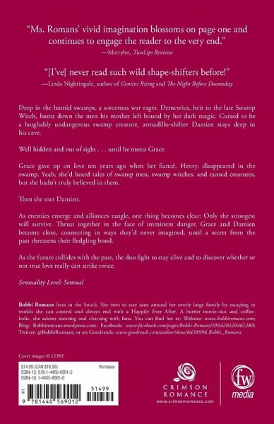 Deep in the humid swamps, a sorcerous war rages. Demetrius, heir to the late Swamp Witch, hunts down the men his mother left bound by her dark magic. Cursed to be a laughably undangerous swamp creature, armadillo shifter Damien stays deep in his cave. Well hidden and out of sight. Until he met Grace. Grace gave up on love ten years ago, when her fiancé, Henry, disappeared in the swamp. Yeah, she'd heard tales of swamp men, swamp witches, and cursed creatures, but she hadn't truly believed in them. Then she met Damien. As enemies emerge and alliances tangle, one thing becomes clear: only the strongest will survive. Thrust together in the face of imminent danger, Grace and Damien become close, connecting in ways they'd never imagined, until a secret from the past threatens their fledgling bond. As the future collides with the past, the duo fight to stay alive and to discover if true love really can strike twice. Sensuality Level: Sensual