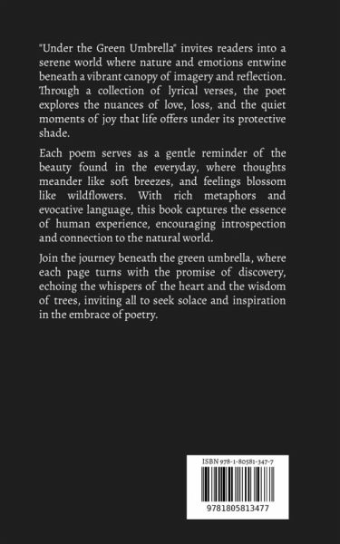 "Under the Green Umbrella" invites readers into a serene world where nature and emotions entwine beneath a vibrant canopy of imagery and reflection. Through a collection of lyrical verses, the poet explores the nuances of love, loss, and the quiet moments of joy that life offers under its protective shade. Each poem serves as a gentle reminder of the beauty found in the everyday, where thoughts meander like soft breezes, and feelings blossom like wildflowers. With rich metaphors and evocative language, this book captures the essence of human experience, encouraging introspection and connection to the natural world. Join the journey beneath the green umbrella, where each page turns with the promise of discovery, echoing the whispers of the heart and the wisdom of trees, inviting all to seek solace and inspiration in the embrace of poetry.