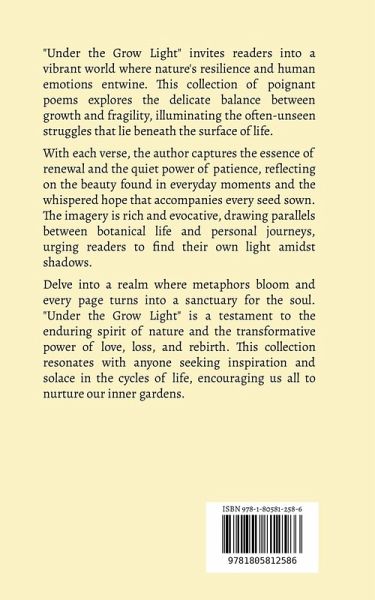 "Under the Grow Light" invites readers into a vibrant world where nature's resilience and human emotions entwine. This collection of poignant poems explores the delicate balance between growth and fragility, illuminating the often-unseen struggles that lie beneath the surface of life. With each verse, the author captures the essence of renewal and the quiet power of patience, reflecting on the beauty found in everyday moments and the whispered hope that accompanies every seed sown. The imagery is rich and evocative, drawing parallels between botanical life and personal journeys, urging readers to find their own light amidst shadows. Delve into a realm where metaphors bloom and every page turns into a sanctuary for the soul. "Under the Grow Light" is a testament to the enduring spirit of nature and the transformative power of love, loss, and rebirth. This collection resonates with anyone seeking inspiration and solace in the cycles of life, encouraging us all to nurture our inner gardens.