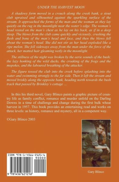A shadowy form moved in a crouch along the creek bank, a stout club upraised and silhouetted against the sparkling surface of the stream. It approached the forms of the man and the woman as they lay quietly on the rug in the moonlight near the water's edge. The woman's head rested on the man's chest as he lay on his back, as if in a deep sleep. The blows from the club came quickly and viciously, crushing the flesh and bone of the man's head and face, and then the blows fell about the woman's head. She did not stir as her head exploded like a ripe melon. She fell sideways away from the man under the force of the attack, her matted hair gleaming wetly in the moonlight. The stillness of the night was broken by the eerie sounds of the bush; the lazy honking of the wild ducks, the croaking of the frogs and the mopokes, and the laboured breathing of the attacker. The figure tossed the club into the creek before splashing into the water and swimming strongly to the far side. Then it left the stream and moved briskly along the opposite bank, heading north towards the bush track that passed by Brinkley's cottage ... In this his third novel, Gary Blinco paints a graphic picture of coun- try life as family conflict, romance and murder unfold on the Darling Downs in a time of challenge and change during the first bulk wheat harvest in 1957. This book provides an entertaining read and works on three levels: as history, romance and mystery, all in a competent way.