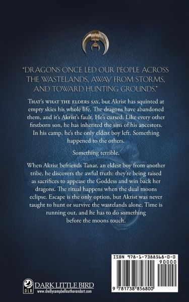 'Dragons once led our people across the wastelands, away from storms, and toward hunting grounds.' That's what the elders say, but eleven-year-old Akrist has squinted at empty skies his whole life. The dragons have abandoned them, and it's Akrist's fault. He's cursed. Like every other firstborn son, he has inherited the sins of his ancestors. In his camp, he's the only eldest boy left. Something happened to the others. Something terrible. When Akrist befriends Tanar, an eldest boy from another tribe, he discovers the awful truth: they're being raised as sacrifices to appease the Goddess and win back her dragons. The ritual happens when the dual moons eclipse. Escape is the only option, but Akrist was never taught to hunt or survive the wastelands alone. Time is running out, and he has to do something before the moons touch.