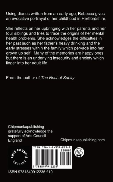 Description Using diaries written from an early age, Rebecca gives an evocative portrayal of her childhood in Hertfordshire. She reflects on her upbringing with her parents and her four siblings and tries to trace the origins of her mental health problems. She acknowledges the difficulties in her past such as her father¿s heavy drinking and the stresses within the family which pervade into her grown up self. Many of the memories are happy ones but there is an underlying insecurity and anxiety which linger into her adult life. About the Author Rebecca Morgan was born in Hertfordshire in 1951. She obtained a degree in Modern History and Politics from Sheffield University in 1973, followed by a Post-Graduate Diploma in Librarianship from Birmingham Polytechnic in 1975. In 1978 she became a Chartered Librarian and has worked for 20 years for Sheffield Libraries, Archives and Information Service. She has experienced severe depression, postnatal depression and psychotic illness during her life. Rebecca is married with one son and lives in Sheffield. This is her second book, following her vivid picture of her years of mental illness in Hertfordshire and Sheffield portrayed in her first book: ¿The Nest of Sanity¿ also published by Chipmunka Publishing. Rebecca Morgan is a pseudonym.