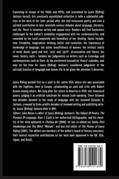 Consisting of essays of the 1960s and 1970s, and assembled by Laura (Riding) Jackson herself, this previously unpublished collection is both a substantial addition to the work of her later period, after she had renounced poetry, and also a spirited contribution to later twentieth-century debates about language, literature, and life. There is immense variety and appeal here. Readers will find themselves challenged by the author's combative engagement with her contemporaries, and rewarded by the lucid complexity and immediacy of her thinking. Topics include: love, friendship, imagination; thinking, belief, and conviction; the importance of knowledge of language; the active unselfishness of women; the intrinsic reality of mind; death; good and evil; 'soul' and 'spirit'; structuralism and theory; the novel, history, myth - besides her judgements on writers such as Coleridge, and contemporaries such as Stein. As the excitement aroused by 'theory' subsides, now may be the time for Laura (Riding) Jackson's considered judgement of the spiritual function of language and human life to be given the attention it deserves.
