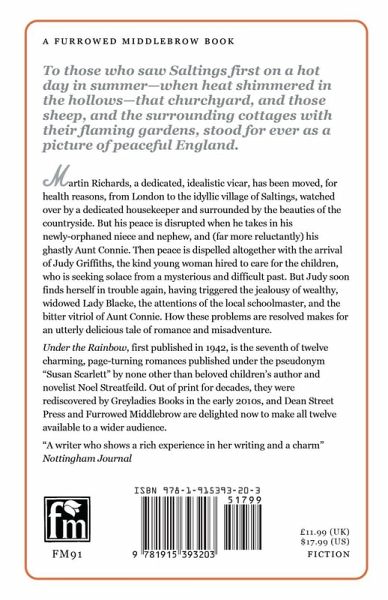 To those who saw Saltings first on a hot day in summer-when heat shimmered in the hollows-that churchyard, and those sheep, and the surrounding cottages with their flaming gardens, stood for ever as a picture of peaceful England. Martin Richards, a dedicated, idealistic vicar, has been moved, for health reasons, from London to the idyllic village of Saltings, watched over by a dedicated housekeeper and surrounded by the beauties of the countryside. But his peace is disrupted when he takes in his newly-orphaned niece and nephew, and (far more reluctantly) his ghastly Aunt Connie. Then peace is dispelled altogether with the arrival of Judy Griffiths, the kind young woman hired to care for the children, who is seeking solace from a mysterious and difficult past. But Judy soon finds herself in trouble again, having triggered the jealousy of wealthy, widowed Lady Blacke, the attentions of the local schoolmaster, and the bitter vitriol of Aunt Connie. How these problems are resolved makes for an utterly delicious tale of romance and misadventure. Under the Rainbow, first published in 1942, is the seventh of twelve charming, page-turning romances published under the pseudonym "Susan Scarlett" by none other than beloved children's author and novelist Noel Streatfeild. Out of print for decades, they were rediscovered by Greyladies Books in the early 2010s, and Dean Street Press and Furrowed Middlebrow are delighted now to make all twelve available to a wider audience. "A writer who shows a rich experience in her writing and a charm" Nottingham Journal