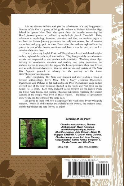 Sentries of the Past is a group of 9th grade students at Webster Schroeder High School who spent six months researching the Hero's Journey pattern as outlined by mythologist Joseph Campbell. From there, the students explored how the pattern is part of the human condition and how it can be used as a tool to examine their own lives. For 60 days, my 9th graders reflected and shared insights as they explored the archetypal hero within. After completing The Sixty Day Sojourn and after reading a book of forensic anthropology, Every Bone Tells a Story: Hominin Discoveries, Deductions, and Debates by Jill Rubalcaba and Peter Robertshaw, each student selected one of the four hominids studied in the work and "put flesh on the bones," so to speak. Each story included doing research on the region where the bones were found, and making educated hypotheses regarding the ancient cultures of the people who lived in those regions.