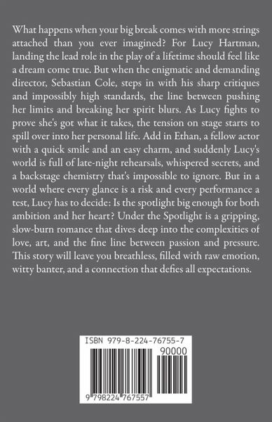What happens when your big break comes with more strings attached than you ever imagined? For Lucy Hartman, landing the lead role in the play of a lifetime should feel like a dream come true. But when the enigmatic and demanding director, Sebastian Cole, steps in with his sharp critiques and impossibly high standards, the line between pushing her limits and breaking her spirit blurs. As Lucy fights to prove she's got what it takes, the tension on stage starts to spill over into her personal life. Add in Ethan, a fellow actor with a quick smile and an easy charm, and suddenly Lucy's world is full of late-night rehearsals, whispered secrets, and a backstage chemistry that's impossible to ignore. But in a world where every glance is a risk and every performance a test, Lucy has to decide: Is the spotlight big enough for both ambition and her heart? Under the Spotlight is a gripping, slow-burn romance that dives deep into the complexities of love, art, and the fine line between passion and pressure. This story will leave you breathless, filled with raw emotion, witty banter, and a connection that defies all expectations.