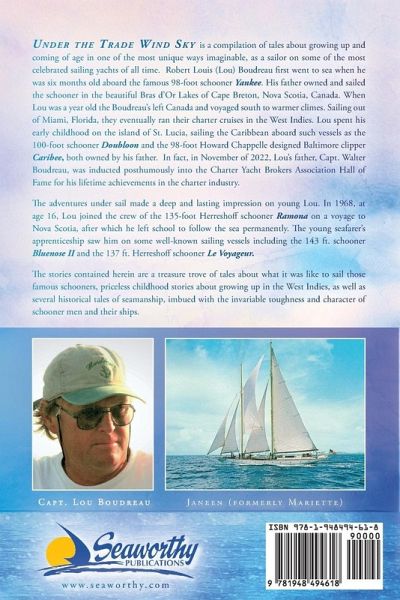 Under the Trade Wind Sky is a compilation of tales about growing up and coming of age in one of the most unique ways imaginable, as a sailor on some of the most celebrated sailing yachts of all time. Robert Louis (Lou) Boudreau first went to sea when he was six months old aboard the famous 98-foot schooner Yankee. His father owned and sailed the schooner in the beautiful Bras D'Or Lakes of Cape Breton, Nova Scotia, Canada. When Lou was a year old the Boudreau's left Canada and voyaged south to warmer climes. Sailing out of Miami, Florida, they eventually ran their charter cruises in the West Indies. Lou spent his early childhood on the island of St. Lucia, sailing the Caribbean aboard such vessels as the 100 ft. schooner Doubloon and the 98 ft. Howard Chappelle designed Baltimore clipper Caribee, both owned by his father. In fact, in November of 2022, Lou's father, Capt. Walter Boudreau, was inducted posthumously into the Charter Yacht Brokers Association Hall of Fame for his lifetime achievements in the charter industry. The adventures under sail made a deep and lasting impression on young Lou. In 1968, at age 16, Lou joined the crew of the 135-foot Herreshoff schooner Ramona on a voyage to Nova Scotia, and following this, left school to follow the sea permanently. The young seafarer's apprenticeship saw him on some well-known sailing vessels including the 143 ft. schooner Bluenose II and the 137 ft. Herreshoff schooner Le Voyageur. The stories contained herein are a treasure trove of tales about what it was like to sail those famous schooners, priceless childhood stories about growing up in the West Indies, as well as several historical tales of seamanship, imbued with the invariable toughness and character of schooner men and their ships.