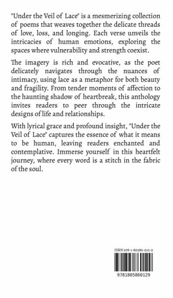 "Under the Veil of Lace" is a mesmerizing collection of poems that weaves together the delicate threads of love, loss, and longing. Each verse unveils the intricacies of human emotions, exploring the spaces where vulnerability and strength coexist. The imagery is rich and evocative, as the poet delicately navigates through the nuances of intimacy, using lace as a metaphor for both beauty and fragility. From tender moments of affection to the haunting shadow of heartbreak, this anthology invites readers to peer through the intricate designs of life and relationships. With lyrical grace and profound insight, "Under the Veil of Lace" captures the essence of what it means to be human, leaving readers enchanted and contemplative. Immerse yourself in this heartfelt journey, where every word is a stitch in the fabric of the soul.
