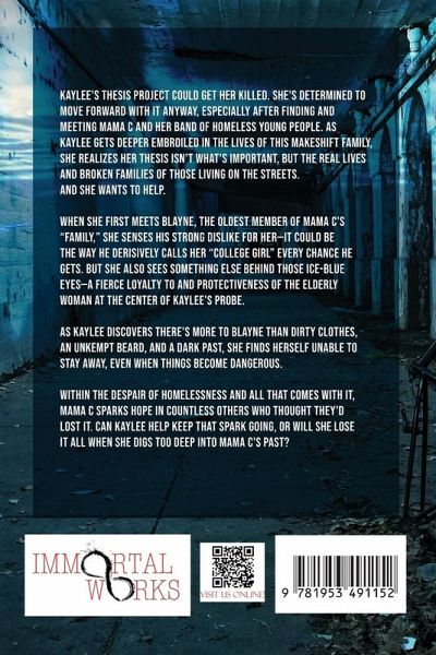 Kaylee's thesis project could get her killed. She's determined to move forward with it anyway, especially after finding and meeting Mama C and her band of homeless young people. As Kaylee gets deeper embroiled in the lives of this makeshift family, she realizes her thesis isn't what's important, but the real lives and broken families of those living on the streets. And she wants to help. When she first meets Blayne, the oldest member of Mama C's "family," she senses his strong dislike for her-it could be the way he derisively calls her "college girl" every chance he gets. But she also sees something else behind those ice-blue eyes-a fierce loyalty to and protectiveness of the elderly woman at the center of Kaylee's probe. As Kaylee discovers there's more to Blayne than dirty clothes, an unkempt beard, and a dark past, she finds herself unable to stay away, even when things become dangerous. Within the despair of homelessness and all that comes with it, Mama C sparks hope in countless others who thought they'd lost it. Can Kaylee help keep that spark going, or will she lose it all when she digs too deep into Mama C's past?