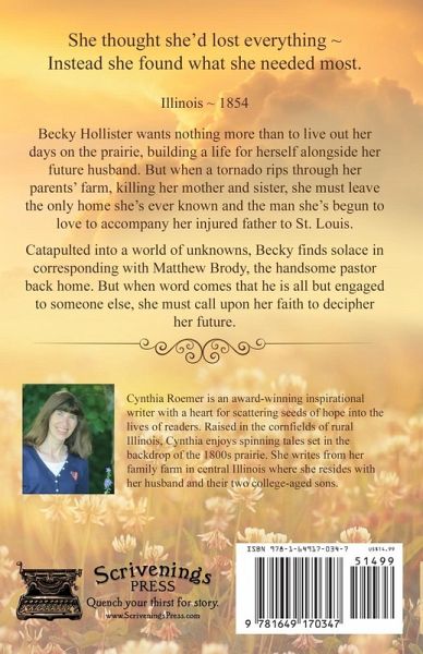 ~ She thought she'd lost everything ~ Instead she found what she needed most. ~ Illinois ~ 1854 Becky Hollister wants nothing more than to live out her days on the prairie, building a life for herself alongside her future husband. But when a tornado rips through her parents' farm, killing her mother and sister, she must leave the only home she's ever known and the man she's begun to love to accompany her injured father to St. Louis. Catapulted into a world of unknowns, Becky finds solace in corresponding with the handsome pastor back home. But when word comes that he is all but engaged to someone else, she must call upon her faith to decipher her future. Matthew Brody didn't intend on falling for Becky, but the unexpected relationship, along with the Lord's gentle nudging, incite him to give up his circuit riding and seek full-time ministry in the town of Miller Creek, with the hope of one day making Becky his bride. But when his old sweetheart comes to town, intent on winning him back-with the entire town pulling for her-Matthew must choose between doing what's expected and what his heart tells him is right.