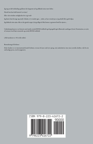 Jeg tog en dyb indånding og blæste det langsomt ud og slikkede mine tørre læber. Havde han kun haft kontrol i en time? Eller i det mindste muligheden for at gå væk? Jeg hørte ham bevæge sig rundt i lokalet, tv'et tændte igen ... indså, at han ventede på, at jeg skulle blive godt tilpas. Jeg lukkede mine øjne, ikke at det gjorde noget, da jeg alligevel ikke kunne se gennem bind for øjnene ... Underdanig fantasi er en historie med stærkt erotisk BDSM-indhold og til gengæld også tilhørende samlingen Erotic Domination, en serie af romaner med højt romantisk og erotisk BDSM-indhold. (Alle karakterer er 18 år eller ældre) Bemærkning til forfatter: Erika Sanders er en internationalt kendt forfatter, oversat til mere end tyve sprog, som underskriver sine mest erotiske skrifter, væk fra sin sædvanlige prosa, med sit pigenavn.
