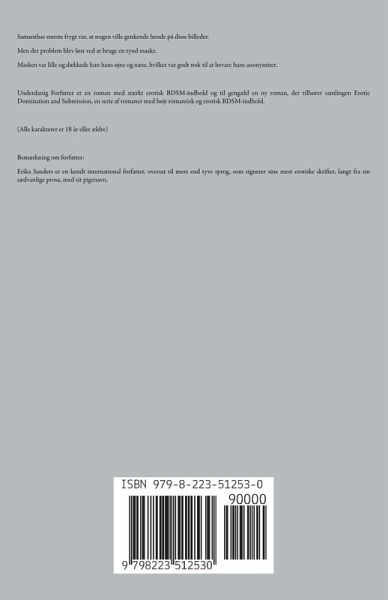 Samanthas største frygt var, at nogen ville genkende hende på disse billeder. Men det problem blev løst ved at bruge en tynd maske. Masken var lille og dækkede kun hans øjne og næse, hvilket var godt nok til at bevare hans anonymitet. Underdanig Forfatter er en roman med stærkt erotisk BDSM-indhold og til gengæld en ny roman, der tilhører samlingen Erotic Domination and Submission, en serie af romaner med højt romantisk og erotisk BDSM-indhold. (Alle karakterer er 18 år eller ældre) Bemærkning om forfatter: Erika Sanders er en kendt international forfatter, oversat til mere end tyve sprog, som signerer sine mest erotiske skrifter, langt fra sin sædvanlige prosa, med sit pigenavn.