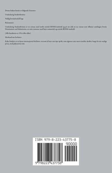 Denne boken består av følgende historier: Underdanig Studentkvinne Veldig forståelsesfull lege På kontoret Underdanig Studentkvinne er en roman med sterkt erotisk BDSM-innhold og på sin side en ny roman som tilhører samlingen Erotic Domination and Submission, en serie romaner med høyt romantisk og erotisk BDSM-innhold. (Alle karakterer er 18 år eller eldre) Merknad om forfatter: Erika Sanders er en kjent internasjonal forfatter, oversatt til mer enn tjue språk, som signerer sine mest erotiske skrifter, langt fra sin vanlige prosa, med pikenavnet sitt.