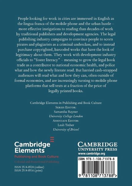 The legal publishing industry in Africa campaigns to convince people to scorn pirates and plagiarists as a criminal underclass, and to instead purchase copyrighted, barcoded works that have the look of legitimacy about them. This Element is a study of the emergence of new forms of reading in English in African cities.