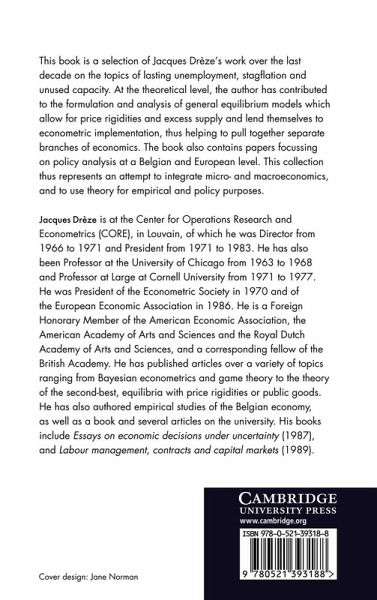 This 1991 book is a selection of Jacques Drèze's work over the last decade on the topics of lasting unemployment, stagflation and unused capacity. At the theoretical level, the author has contributed to the formulation and analysis of general equilibrium models which allow for price rigidities and excess supply and lend themselves to econometric implementation, thus represents an attempt to integrate micro- and macroeconomics, and to use theory for empirical and policy purposes.