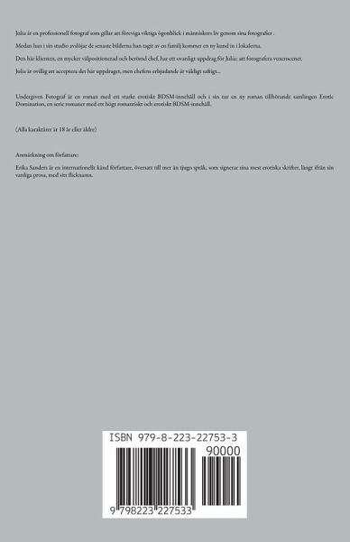 Julia är en professionell fotograf som gillar att föreviga viktiga ögonblick i människors liv genom sina fotografier . Medan han i sin studio avslöjar de senaste bilderna han tagit av en familj kommer en ny kund in i lokalerna. Den här klienten, en mycket välpositionerad och berömd chef, har ett ovanligt uppdrag för Julia: att fotografera vuxenscener. Julia är ovillig att acceptera det här uppdraget, men chefens erbjudande är väldigt saftigt... Undergiven Fotograf är en roman med ett starkt erotiskt BDSM-innehåll och i sin tur en ny roman tillhörande samlingen Erotic Domination, en serie romaner med ett högt romantiskt och erotiskt BDSM-innehåll. (Alla karaktärer är 18 år eller äldre) Anmärkning om författare: Erika Sanders är en internationellt känd författare, översatt till mer än tjugo språk, som signerar sina mest erotiska skrifter, långt ifrån sin vanliga prosa, med sitt flicknamn.