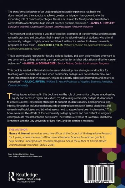 Foreword Preface Acknowledgments Part One. Background1. Access Equity 2. Undergraduate Research at Community Colleges 3. Overview of Five Systems 4. Ensuring Student OpportunitiesPart Two. Examples of Undergraduate Research5. Basic Research and Applied Research 6. Course-Based Research and Educational Equity 7. Community-Based Research 8. Interdisciplinary Research 9. Community College Partnerships Part Three. Next Steps10. Inclusive Pedagogy 11. Assessing Undergraduate Research 12. Advancing Undergraduate ResearchReferences About the Author Index