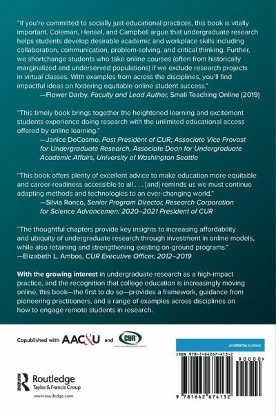 With the growing interest in undergraduate research as a high-impact practice, and the recognition that college education is increasingly moving online, this book - the first to do so - provides a framework, guidance from pioneering practitioners, and a range of examples across disciplines on how to engage remote students in research.