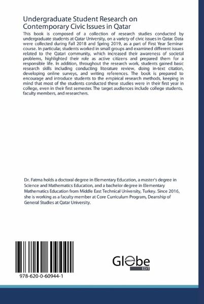 This book is composed of a collection of research studies conducted by undergraduate students at Qatar University, on a variety of civic issues in Qatar. Data were collected during Fall 2018 and Spring 2019, as a part of First Year Seminar course. In particular, students worked in small groups and examined different issues related to the Qatari community, which increased their awareness of societal problems, highlighted their role as active citizens and prepared them for a responsible life. In addition, throughout the research work, students gained basic research skills including conducting literature review, doing in-text citation, developing online surveys, and writing references. The book is prepared to encourage and introduce students to the empirical research methods, keeping in mind that most of the students conducted these studies were in their first year in college, even in their first semester. The target audiences include college students, faculty members, and researchers.