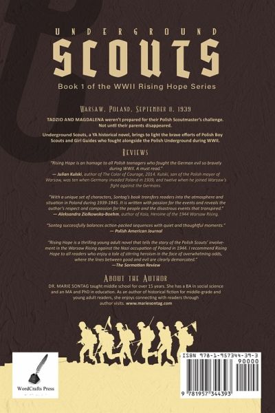 Warsaw, PolandSeptember 8, 1939 Their scoutmaster's chair squeaked as he shifted his weight. "What I am about to ask from all of you is a personal sacrifice on behalf of Poland. Your final decision is, of course, up to you. You must each make your own decision." A hush filled the room. The Scouts' pale faces betrayed the struggle that plagued them all. Tadzio broke the spell. "I mean no disrespect, Professor. I don't know why my father had to leave, but since he's gone, my family is my priority." Squaring her shoulders, Magdalena inched forward on her chair. "And earlier this week my father's brother and his wife were killed when a bomb hit their apartment building in Warsaw." Her voice quivered. "Now, we're also caring for our orphaned 11-year-old cousin, Józefina." Tadzio nodded. "Since I am the eldest son, my first responsibility is to my family." "Well spoken, son." Professor Handelsman studied Tadzio over the top of his glasses. "What about the rest of you?" Tadzio's patrol leader, Andrzej, spoke first. "This is what we've prepared for all summer. The Scout training we received in the Kampinos Forest these past few months-first aid, food storage, water purification, map reading skills, Morse Code, riflery-it all prepared us for this moment. I will give my all for Poland." Lech smoothed back his thick, black hair. "Andrzej's right. It's time to take a stand." First Lech, then Andrzej, and finally Lech's younger brother, Stefan, rose to their feet with raised chins, they punched their fists into the air and shouted in unison. "Czuwaj! Be vigilant! Stay awake! Be prepared!" Tadzio and Magdalena weren't prepared for their Polish Scoutmaster's challenge. Not until their parents disappeared. A Young Adult historical novel, Underground Scouts brings to light the brave efforts of Polish Boy Scouts and Girl Guides who fought alongside the Polish Underground during World War II.