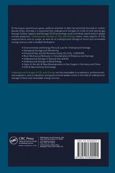 Of the known greenhouse gases, political attention to date has primarily focused on carbon dioxide (CO2), whereby it is assumed that underground storages of crude oil and natural gas through Carbon Capture and Storage (CCS) technology could contribute significantly to global climate protection. Underground Storage of CO2 and Energy covers many aspects of CO2 sequestration and its usage, as well as of underground storage of fossil and renewable energy sources, and is divided into 8 parts: * Environmental and Energy Policy & Law for Underground Storage * Geological Storage and Monitoring * Enhanced Gas and Oil Recovery Using CO2 (CO2 -EGR/EOR) * Rock Mechanical Behavior in Consideration of Dilatancy and Damage * Underground Storage of Natural Gas and Oil * Underground Storage of Wind Energy * State-of-the-Art & New Developments in Gas Supply in Germany and China * EOR & New Drilling Technology Underground Storage of CO2 and Energy will be invaluable to academics, professionals and engineers, and to industries and governmental bodies active in the field of underground storage of fossil and renewable energy sources.