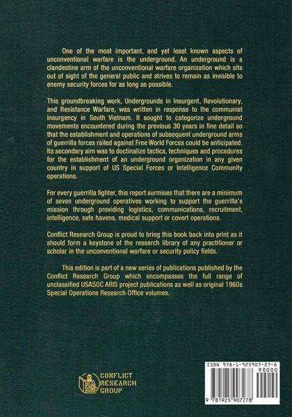 This groundbreaking work, Undergrounds in Insurgent, Revolutionary, and Resistance Warfare, was written in response to the communist insurgency in South Vietnam. It sought to categorize underground movements encountered during the previous 30 years in fine detail so that the establishment and operations of subsequent underground arms of guerrilla forces railed against Free World Forces could be anticipated, located and disrupted or destroyed. Its secondary aim was to doctinalize tactics, techniques and procedures for the establishment of underground organizations in any given country in support of US Special Forces or Intelligence Community operations. One of the most important, and yet least known aspects of unconventional warfare is the underground. An underground is a clandestine arm of the unconventional warfare organization which sits out of sight of the general public and strives to remain as invisible to enemy security forces for as long as possible. For every guerrilla fighter, this report surmises that there are a minimum of seven underground operatives working to support the guerrilla's mission through providing logistics, communications, recruitment, intelligence, safe havens, medical support or covert operations. Conflict Research Group is proud to bring this book back into print as it should form a keystone of the research library of any practitioner or scholar in the unconventional warfare or security policy fields.