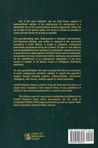 This groundbreaking work, Undergrounds in Insurgent, Revolutionary, and Resistance Warfare, was written in response to the communist insurgency in South Vietnam. It sought to categorize underground movements encountered during the previous 30 years in fine detail so that the establishment and operations of subsequent underground arms of guerrilla forces railed against Free World Forces could be anticipated, located and disrupted or destroyed. Its secondary aim was to doctinalize tactics, techniques and procedures for the establishment of underground organizations in any given country in support of US Special Forces or Intelligence Community operations. One of the most important, and yet least known aspects of unconventional warfare is the underground. An underground is a clandestine arm of the unconventional warfare organization which sits out of sight of the general public and strives to remain as invisible to enemy security forces for as long as possible. For every guerrilla fighter, this report surmises that there are a minimum of seven underground operatives working to support the guerrilla's mission through providing logistics, communications, recruitment, intelligence, safe havens, medical support or covert operations. Conflict Research Group is proud to bring this book back into print as it should form a keystone of the research library of any practitioner or scholar in the unconventional warfare or security policy fields.