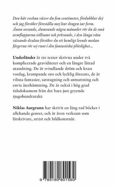 UNDERLÄNDER är tre texter skrivna under två komplicerade graviditeter och en längre lättad utandning. De är svindlande dröm och krass vardag, krampande oro och lycklig föresats, de är vilsna fantasier, satstagning och utmattning och envis återhämtning och nystart. De är också i hög grad tidsdokument från det bara just gryende tjugohundratalet.