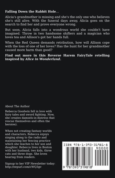 Falling Down the Rabbit Hole… Alicia's grandmother is missing and she's the only one who believes she's still alive. With the funeral days away, Alicia goes on the search to find her and prove everyone wrong. But soon, Alicia falls into a wondrous world she couldn't have imagined. Throw in two handsome shifters and a magician who loves tea and Allison's got her hands full. When the Red Queen demands retribution, how will Allison cope with the loss of one of her loves? Has the hunt for her grandmother caused more harm than good? Find out more in this Reverse Harem FairyTale retelling inspired by Alice in Wonderland.