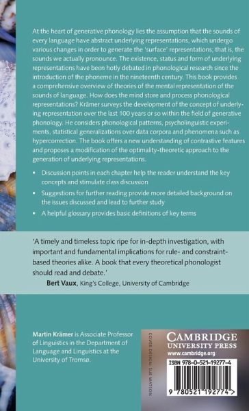 At the heart of generative phonology lies the assumption that the sounds of every language have abstract underlying representations, which undergo various changes in order to generate the 'surface' representations; that is, the sounds we actually pronounce. The existence, status and form of underlying representations have been hotly debated in phonological research since the introduction of the phoneme in the nineteenth century. This book provides a comprehensive overview of theories of the mental representation of the sounds of language. How does the mind store and process phonological representations? Krämer surveys the development of the concept of underlying representation over the last 100 years or so within the field of generative phonology. He considers phonological patterns, psycholinguistic experiments, statistical generalisations over data corpora and phenomena such as hypercorrection. The book offers a new understanding of contrastive features and proposes a modification of the optimality-theoretic approach to the generation of underlying representations.