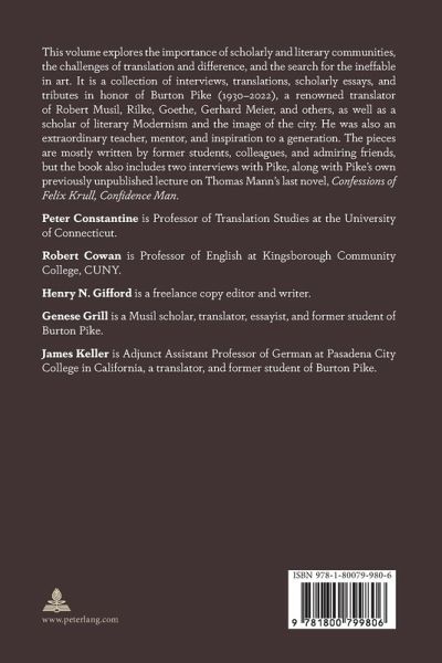 This volume explores the importance of scholarly and literary communities, the challenges of translation and difference, and the search for the ineffable in art. It is a collection of interviews, translations, scholarly essays, and tributes in honor of Burton Pike (1930-2022), a renowned translator of Robert Musil, Rilke, Goethe, Gerhard Meier, and others, as well as a scholar of literary Modernism and the image of the city. He was also an extraordinary teacher, mentor, and inspiration to a generation. The pieces are mostly written by former students, colleagues, and admiring friends, but the book also includes two interviews with Pike, along with Pike's own previously unpublished lecture on Thomas Mann's last novel, Confessions of Felix Krull, Confidence Man.