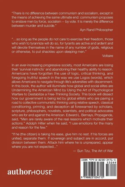 In an ever-increasing progressive society, most Americans are losing their 'survival instincts' and abandoning their healthy ability to reason. Americans have forgotten the use of logic, critical thinking, and foregoing truthful speech in the way we use Logos (words), which allows Americans to navigate through life's adversities with discernment. In this book, the author will illuminate how global and social elites are Undermining the American Mind by Using the Art of Psychological Warfare to Destabilize a Free-Thinking Society. This book will dissect how our government is being led by global elitists who are paving a road to collective communistic thinking using relative speech, classical conditioning, priming, and deception all forewarned by scholars, scripture, philosophers, novelists, scientists, and political advocates who are for and against the American. Edward L. Bernays, Propaganda, said, "Men are rarely aware of the real reasons which motivate their actions." Adolph Hitler when he said, "I use emotions for the many and reason for the few."