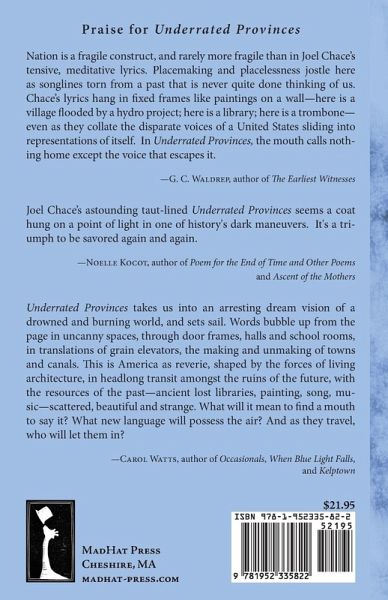Nation is a fragile construct, and rarely more fragile than in Joel Chace's tensive, meditative lyrics. Placemaking and placelessness jostle here as songlines torn from a past that is never quite done thinking of us. Chace's lyrics hang in fixed frames like paintings on a wall-here is a village flooded by a hydro project; here is a library; here is a trombone- even as they collate the disparate voices of a United States sliding into representations of itself. In Underrated Provinces, the mouth calls noth- ing home except the voice that escapes it. -G. C. Waldrep, author of The Earliest Witnesses Joel Chace's astounding taut-lined Underrated Provinces seems a coat hung on a point of light in one of history's dark maneuvers. It's a tri- umph to be savored again and again. -Noelle Kocot, author of Poem for the End of Time and Other Poems and Ascent of the Mothers Underrated Provinces takes us into an arresting dream vision of a drowned and burning world, and sets sail. Words bubble up from the page in uncanny spaces, through door frames, halls and school rooms, in translations of grain elevators, the making and unmaking of towns and canals. This is America as reverie, shaped by the forces of living architecture, in headlong transit amongst the ruins of the future, with the resources of the past-ancient lost libraries, painting, song, mu- sic-scattered, beautiful and strange. What will it mean to find a mouth to say it? What new language will possess the air? And as they travel, who will let them in? -Carol Watts, author of Occasionals, When Blue Light Falls, and Kelptown