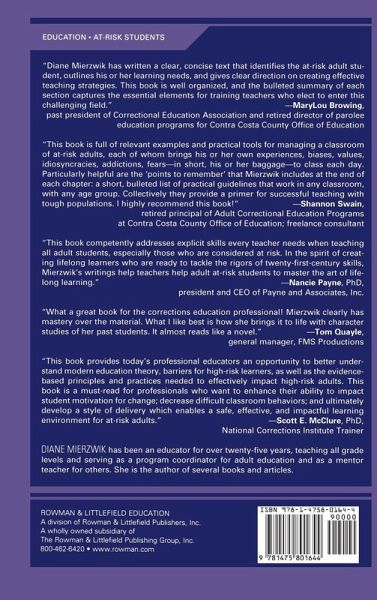 Preface Introduction Part One: Understanding the At-Risk Adult Student Defining "At-Risk"Undiagnosed Learning Disabilities and Behavioral DisordersSubstance Abuse Induced Brain DysfunctionChronic Criminogenic BehaviorsThe Adult BrainPart Two: Teaching the At-Risk Adult Student Managing the At-Risk Adult LearnerClassroom EnvironmentDelivery of New MaterialsExplicit Teaching of Problem-Solving SkillsThe Use of Graphic Organizers and Other Non-traditional Teaching StrategiesGroup Processing and Cooperative Learning Strategies