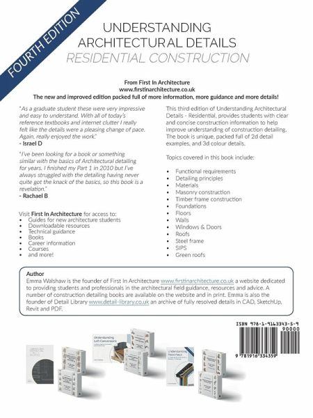 Understanding Architectural Details - Residential is packed full of over 120 construction details in 2D and 3D. This new 4th Edition has been updated in line with the June 2022 Building Regulations updates. We look at the principles behind construction detailing, and delve deep into each area of the building to make sure you have a full understanding of construction design. The Key PrinciplesFunctional Requirements Detailing Principles Materials Foundationsstrip foundations pad foundations pile foundations raft foundations Masonry Constructionground bearing floors suspended floors walls (including cladding options) roofs (flat and pitched) doors and windows Timber Frame Constructionground bearing floors suspended floors walls (including cladding options) roofs (flat and pitched) doors and windows Steel Frame Constructionfloors walls roofs Structural Insulated Panels (SIPS)floors walls (with cladding options) doors and windows roofs Insulated Concrete Formwork (ICF)floors walls windows roofs Green Roof Constructionintensive extensive