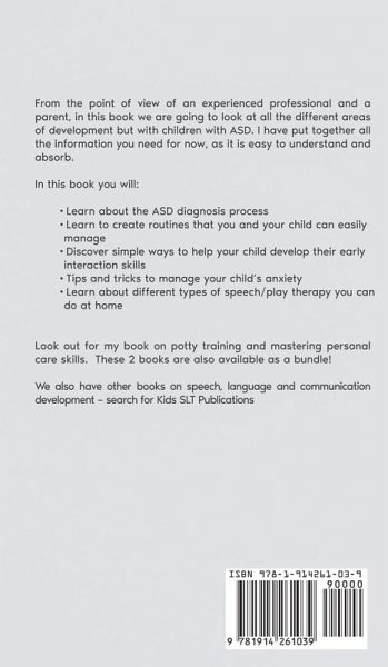 According to statistics reported by CDC in 2020, 1 in 54 children in the USA were diagnosed with autism spectrum disorder (ASD) in 2016. It is suggested that boys are 4 times more likely to get a diagnosis of autism than girls. Autism does not discriminate; it effects all ethnicities and socio-economic groups. Getting the diagnosis and intervention early is better however unfortunately this does not happen for all families. Like so many parents, you might be wondering if you are doing things right. Aside from being a Speech and Language Therapist, I am also a mum and I know the worry we put ourselves through. Speech and language are a highly complex learning areas that we take for granted. This is especially difficult if your child has more complex needs. If you have received a recent autism diagnosis, you mind is probably full of questions, you have likely been looking for answers on the internet. If this sounds like you, then you will have noticed hundreds of different sites offering information which is too complex and lengthy for light bedtime reading which is probably the only time you'll have to read without being distracted by what your child is doing. From the point of view of an experienced professional and a parent, we are going to look at all the different areas of development but with children with ASD. I have put together all the information you need for now as it is easy to understand and absorb. This is the first book in this series, the other books will focus on all the different areas of difficulties. In this book... - Learn about the ASD diagnosis process - Learn to create routines that you and your child can easily manage - Discover simple ways to help your child develop their early interaction skills - Tips and tricks to manage your child's anxiety - Learn about different types of speech/play therapy you can do at home The next book is on potty training and mastering personal care skills. There will be books focusing on speech and language development and much more so look out for those.