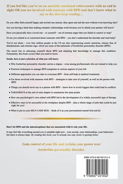If you feel like you're on an unstable emotional rollercoaster with no end in sight, OR if you are involved with someone with BPD and don't know what to say or do, then keep reading. Do you often feel so happy and excited one minute, then upset and sad the next without even knowing why? Are you having a hard time making romantic relationships work because you're terribly afraid that your partner will leave? Have you physically hurt a loved one - or yourself - out of extreme anger that you failed to control or stop? Or are you related to or are concerned about someone with BPD and you don't understand the disorder and want help? You're not alone - over four million people in the US are also experiencing erratic emotions, intense fear of abandonment, and extreme rage, which are some of the hallmarks of borderline personality disorder (BPD). In today's harsh and overcritical world, labeling someone as "manipulative," "dangerous," or even "crazy" is quite easy without knowing how painful it is... especially for someone with BPD. What's worse, the symptoms of BPD are not limited to one aspect of your life - it can manifest in several areas including your mood, behavior, and self-image. This may be the reason you find it challenging to keep your emotions in check, sustain relationships, succeed at work, or even control your finances. Thankfully, contrary to popular belief, living with BPD is not hopeless - it can be managed and treated. The secret lies in educating yourself about BPD and harnessing that knowledge to cope with this condition. Fortunately, this book covers what you need to know. Inside, here is just a fraction of what you will discover:Why borderline personality disorder carries a stigma... even among professionals who are trained to help you For those involved with someone with BPD, strategies to take care of yourself, as well as the person with BPD Things you should never say to a person with BPD - know how to avoid triggers that could lead to conflict Practical techniques to manage BPD symptoms in various aspects of your life Different approaches you can take to overcome BPD ... from self-help to medical treatments TAKEAWAYS at the end of each chapter to summarize the main points before moving on to the next chapter How one psychologist's own ordeal with BPD led to the development of a widely successful type of therapy Effective ways to be successful at the workplace despite BPD - plus a whole range of jobs that could be just right for you! What to put in your SELF-CARE BOX... think of it as your personalized mental first-aid kit And much more. Don't let BPD and the misconceptions that are associated with it rule your life. Remember: You did not choose to have this condition. What you CAN choose is the right and healthy way to deal with your symptoms, as well as the methods that will work best for you to overcome BPD. It may feel like everything around you is unstable now - your moods, your relationships, your behaviors - but there is always hope. By reading this book, you are already one step closer to getting better.To gain control of your life and reclaim your power over borderline personality disorder, order this book today!