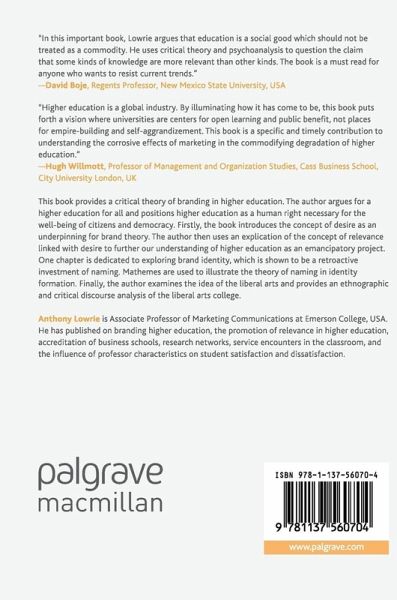 This book provides a critical theory of branding in higher education. The author argues for a higher education for all and positions higher education as a human right necessary for the well-being of citizens and democracy. Firstly, the book introduces the concept of desire as an underpinning for brand theory. The author then uses an explication of the concept of relevance linked with desire to further our understanding of higher education as an emancipatory project. Chapter 4 explores brand identity, which is shown to be a retroactive investment of naming. Mathemes are used to illustrate the theory of naming in identity formation. Finally, the author also examines the idea of the liberal arts and provides an ethnographic and critical discourse analysis of the liberal arts college.