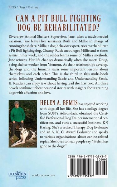 The characters involved in the activities at the Riverview Animal Shelter return in this third book of the series. Rehabilitating a battle-scarred, fierce former fighting dog, Champ, a Pit Bull Terrier, presents a major challenge. A different challenge is faced by a woman who must decide whether or not the man with whom she has fallen in love has indeed been rehabilitated himself, after extended incarceration in his youth. The lessons in Champ relate to training dogs, certainly, and rehabilitating Pit Bull fighting dogs in particular, but they extend to the rehabilitation of people who have erred, who have paid, and who have been changed, a theme that Helen Bemis started in the first book, Understanding Sassie, concerning a woman who was fired for misbehavior from her job; Helen has extended this question to marrying an ex-con in Understanding Champ. Besides offering entertainment, this book's intent is, in part, to guide its readers to no longer fear breeds like the Pit Bull Terrier that have exaggerated reputations for aggression. Certainly, one should choose a breed that reflects one's own energy level. (Helen has a Great Dane.) There are many dogs who will provide companionship and protection if treated with love, and their owners will be richly rewarded for taking them into their lives. From the author: "In my many years of teaching dog obedience, I have discovered that not all humans understand what their dog is trying to tell them. I've enjoyed my opportunities to teach classes on dog communication (the body language of dogs). My goal has always been to reach a wider audience, which publishing my books will allow. "I've always enjoyed telling stories. I have discovered that stories can help us to remember and learn valuable information. I hope the reader will find these stories entertaining and informative." This is the third in this multi-book series, following Understanding Sassie and Understanding Sassie, II. Readers can enjoy it without having read the first two. All three novels combine upbeat personal stories with insights about training dogs with affection and love.