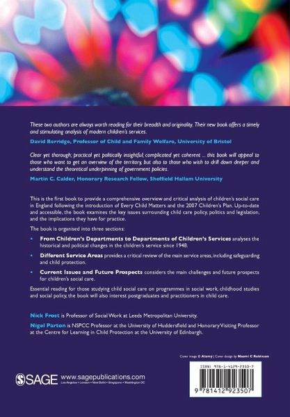""These two authors are always worth reading for their breadth and originality. Their new book offers a timely and stimulating analysis of modern children's services"" David Berridge, Professor of Child and Family Welfare, University of Bristol ""Clear yet thorough; practical yet politically insightful; complicated yet coherent ... this book will appeal to those who want to get an overview of the territory, but also to those who wish to drill down deeper and understand the theoretical underpinning of government policies"" Martin C Calder, Honorary Research Fellow, Sheffield Hallam Univeristy This is the first book to provide a comprehensive overview and critical analysis of children's social care in England following the introduction of Every Child Matters and the 2007 Children's Plan. Up-to-date and accessible, the book examines the key issues surrounding child care policy, politics and legislation, and the implications they have for practice. The book is organised into three sections: - From Children's Departments to Departments of Children's Services analyses the historical and political changes in the children's service since 1948. - Different Service Areas provides a critical review of the main service areas, including safeguarding and child protection. - Current Issues and Future Prospects considers the main challenges and future prospects for children's social care. Essential reading for those studying child social care on programmes in social work, childhood studies and social policy, the book will also interest postgraduates and practitioners in child care.