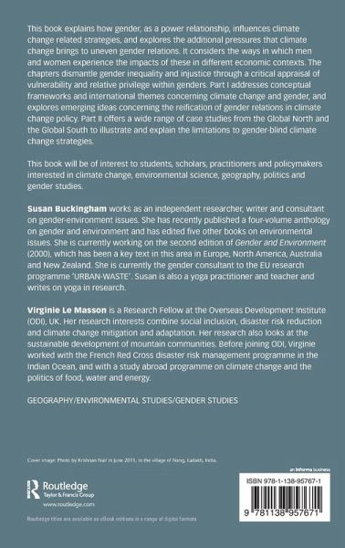 Attempts to understand the production and impacts of climate change and proposals for mitigation and adaptation through gender analyses are thin on the ground. This book explains how gender, as a power relationship, influences climate change related strategies and considers the additional pressure that climate change puts on uneven gender relations and the ways in which men and women experience the impacts of these in different economic contexts. The chapters dismantle gender inequality and injustice through a critical appraisal of vulnerability and relative privilege within genders. It will be of interest to students, scholars and policy makers working in climate change, politics and gender studies.
