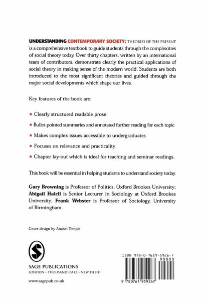 Theory, Theorists and Themes - Gary Browning, Abigail Halcli and Frank Webster A User¿s Guide to Understanding the Present PART ONE: THEORIES Postmodernism - Christopher Norris A Guide for the Perplexed Post-Feminism - Mich[gr]ele Barrett Post-History - Krishan Kumar Living at the End Post-Marxism - Terrell Carver Post-Colonialism and Beyond - Don Robotham Reflexive Modernization - Ted Benton Narrative - Susan Stephenson Rational Choice Theory - John Scott Complexity Theory - Tim Blackman Contemporary Liberalism - Gary Browning Democracy - Nick Hewlett Liberal and Direct Communitarianism - Elizabeth Frazer New Thinking in International Relations - Kimberly Hutchings Utopia and Dystopia - Stephen Crook PART TWO: THEMES Post-Modernity - David Lyon Globalization - Barrie Axford Restructuring - Andy Kilmister Cities in the Global Economy - Saskia Sassen Cultural Studies - Rick Maxwell Intellectuals - Carl Boggs Higher Education - Frank Webster Mass Communication - Kaarle Nordenstreng The Web - Vincent Mosco Nationalism - Murray Low Islam - Sarah Ansari Cultural Pluralism Today - Avigail Eisenberg Families and Households - Mary Maynard The Body - Chris Shilling Intimate Choices - Ken Plummer Environmentalism - David Pepper Social Movements - Abigail Halcli Social Inequalities - Harriet Bradley Coming to Terms with Complexity