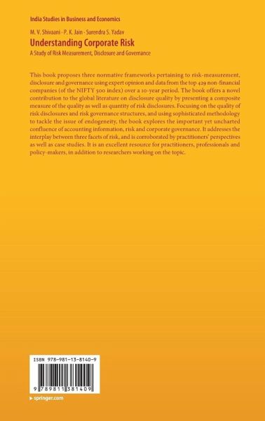 Corporate risk management: An introduction.- Research methodology.- Normative framework for risk index and its empirical analysis.- Normative framework for risk disclosure index and its empirical analysis.- Normative framework for risk governance index and its empirical analysis.- Examining risk- return relationship.- Moderating role of governance in risk-disclosure relationship.- Practitioners' perspective on risk.- Case studies.- Summary and concluding observations.