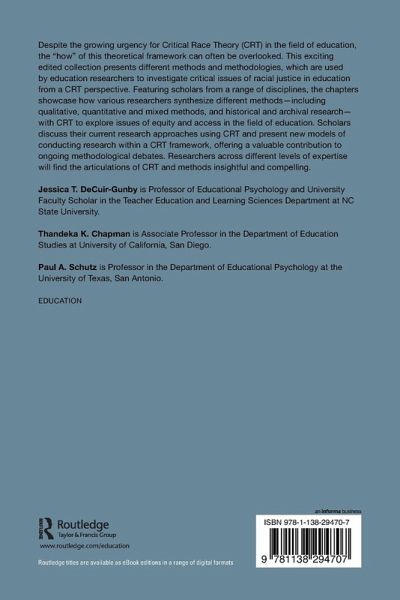 Despite the growing urgency for Critical Race Theory (CRT) in the field of education, the "how" of this theoretical framework can often be overlooked. This exciting edited collection presents different methods and methodologies, which are used by education researchers to investigate critical issues of racial justice in education from a CRT perspective. Featuring scholars from a range of disciplines, the chapters showcase how various researchers synthesize different methods-including qualitative, quantitative and mixed methods, and historical and archival research-with CRT to explore issues of equity and access in the field of education. Scholars discuss their current research approaches using CRT and present new models of conducting research within a CRT framework, offering a valuable contribution to ongoing methodological debates. Researchers across different levels of expertise will find the articulations of CRT and methods insightful and compelling.